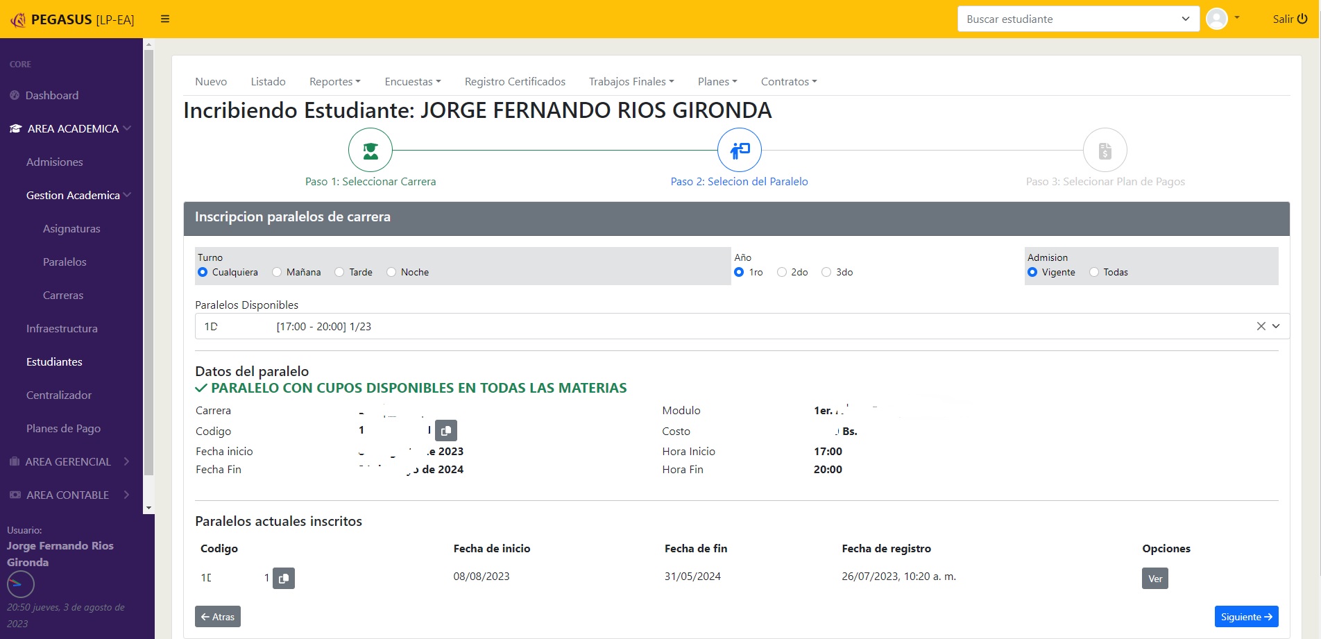 Gestión académica; paralelos, asignaturas, sucursales, admisiones, wizard de inscripciones, gestión de notas